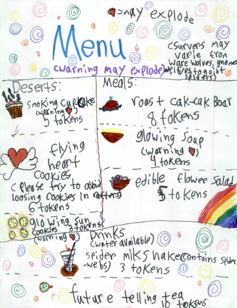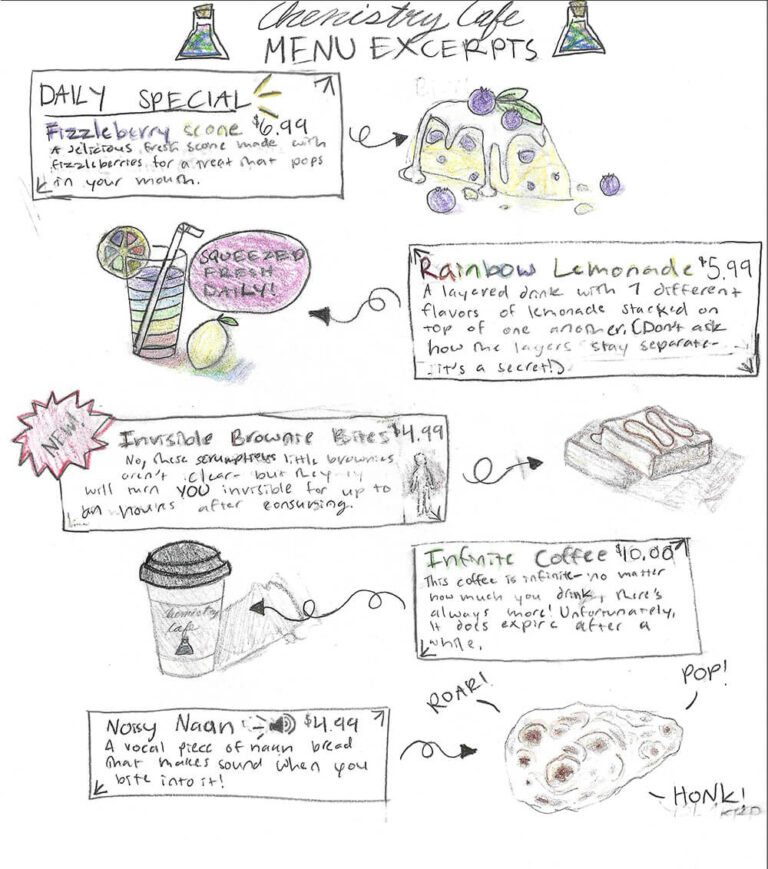 In the March/April 2025 issue of MUSE (published in CRICKET September/October 2025), we asked you to dream up a menu of delicious creations cooked up in your kitchen/laboratory.